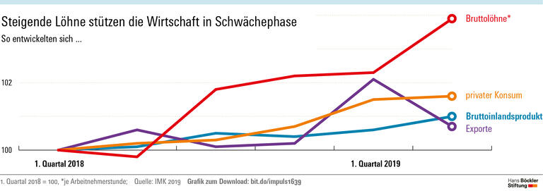 Ein wichtiger Grund: Lohnsteigerungen und der Beschäftigungszuwachs lassen in diesem Jahr die Bruttolöhne um 4 Prozent steigen. Noch etwas stärker fällt mit 4,2 Prozent der Zuwachs bei den Nettolöhnen aus. Laut IMK trägt dazu unter anderem die Rückkehr zur paritätischen Finanzierung der Krankenversicherung bei; seit Anfang 2019 entfallen die Kosten wieder zu gleichen Teilen auf Versicherte und Arbeitgeber, die Arbeitnehmer müssen also nicht mehr allein für die Zusatzbeiträge aufkommen. Hinzu kommen Änderungen beim Einkommenssteuertarif und die Anhebung des Kindergeldes zur Jahresmitte. Alles in allem steigen die verfügbaren Einkommen im laufenden Jahr real um 1,4 Prozent, 2020 um 1,2 Prozent. Diese Zuwächse sorgen für ein stabiles Konsumklima – und halten die Konjunktur am Laufen.