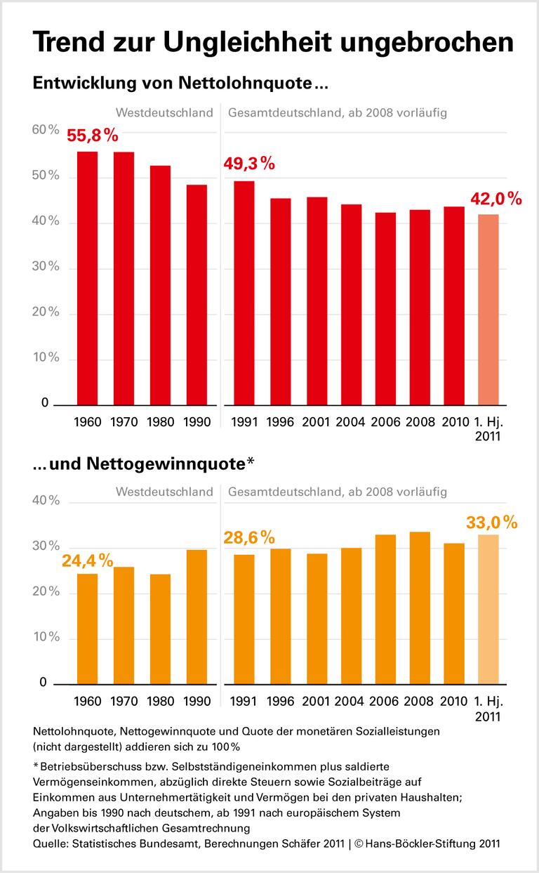 Wie das Kaufkraftpotenzial der Arbeitseinkommen langfristig schrumpft, lässt sich unter anderem an der Netto-Lohnquote ablesen. Das Statistische Bundesamt hat die Daten ab 1991 neu berechnet. Deren Niveau hat sich dadurch etwas nach oben verändert, die Tendenz nicht. Nach Abzug von Steuern und Abgaben erreichte die Lohnquote zwischen 1960 und Ende der 1980er-Jahre noch ein Niveau von über 50 Prozent. Seit 2005 schwankt sie zwischen gut 42 und knapp 44 Prozent. Im ersten Halbjahr 2011 waren es 42 Prozent. Zwar dürfte sich die Netto-Quote in der zweiten Jahreshälfte etwas erhöhen, weil dann Urlaubs- und Weihnachtsgelder gezahlt werden. Der Trend bleibe aber ungebrochen, betont der Forscher. „Die Lohneinkommen verlieren an Gewicht gegenüber den Gewinn- und Kapitaleinkommen, die überwiegend einer relativ kleinen Bevölkerungsgruppe zufließen.“ Die Nettogewinnquote stieg im ersten Halbjahr 2011 auf 33 Prozent und ist damit fast wieder auf dem  historischen Höchststand vor der Finanzkrise 2008.