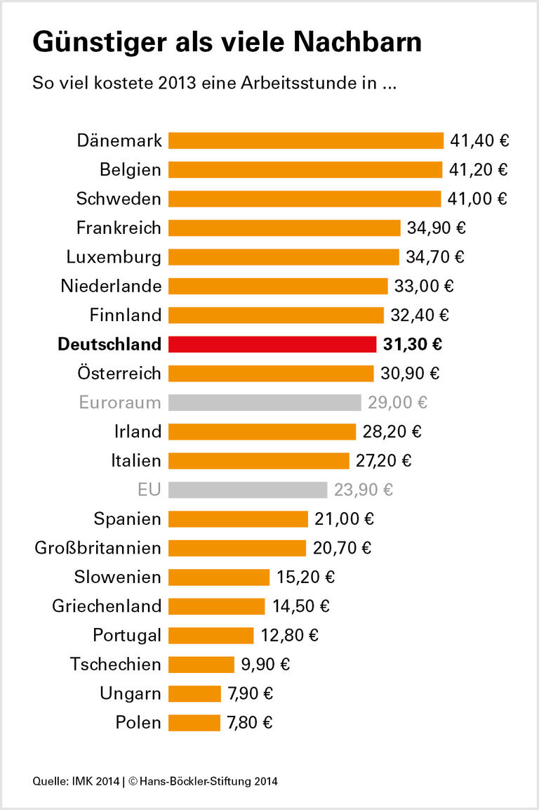 Mit einer Zunahme um 1,4 Prozent haben sich die Arbeitskosten in der deutschen Privatwirtschaft 2013 ähnlich schwach entwickelt wie im EU-Durchschnitt. Im ersten Halbjahr 2014 lag die Zuwachsrate sogar unter dem EU-Mittel. Dabei wäre eine dynamischere Entwicklung ökonomisch wünschenswert, so das IMK. Was Arbeit in Europa kostet, haben die Forscher mithilfe aktueller Daten der EU-Statistikbehörde Eurostat berechnet.* Demnach schlug eine Arbeitsstunde hierzulande im vergangenen Jahr mit 31,30 Euro zu Buche. Damit gehöre Deutschland zum „unteren Bereich der Gruppe der Hochlohnländer“. An der Spitze rangieren Dänemark, Belgien und Schweden mit jeweils rund 41 Euro. Der Durchschnittswert der Euroländer liegt bei 29 Euro.