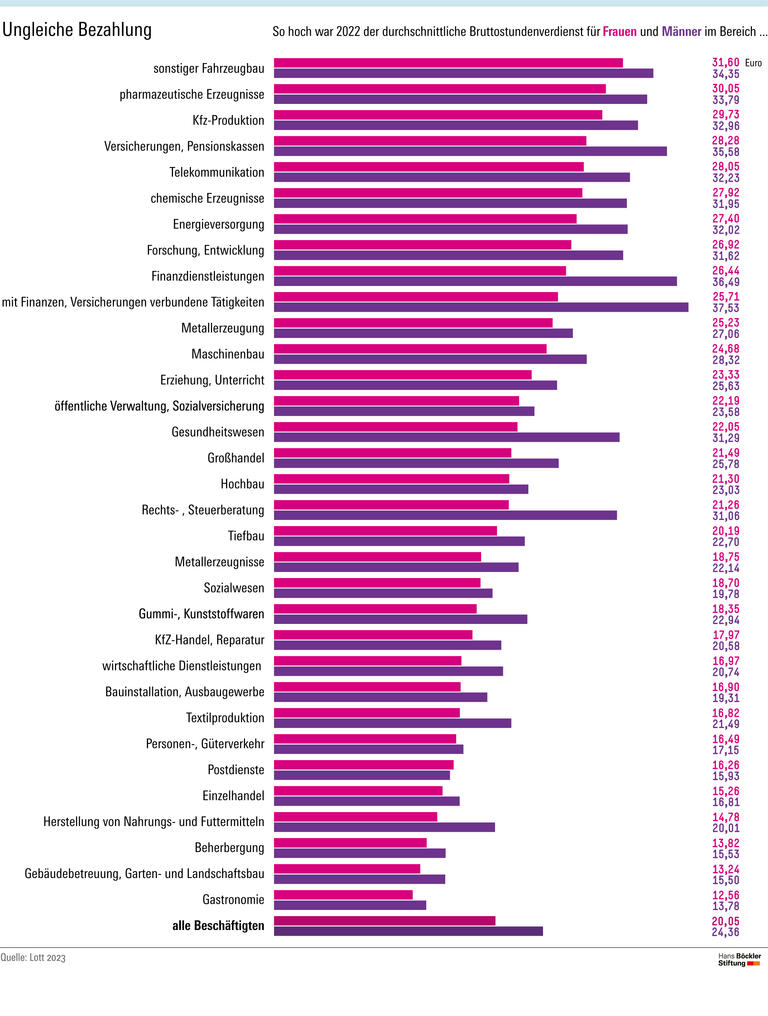 Laut einer aktualisierten Auswertung des WSI verdienten sie 2022 im Schnitt 20,05 Euro brutto pro Stunde und damit 4,31 Euro oder 18 Prozent weniger als die Männer. Am größten ist der Rückstand mit 11,82 Euro pro Stunde bei den mit Finanz- und Versicherungsdienstleistungen verbundenen Tätigkeiten.