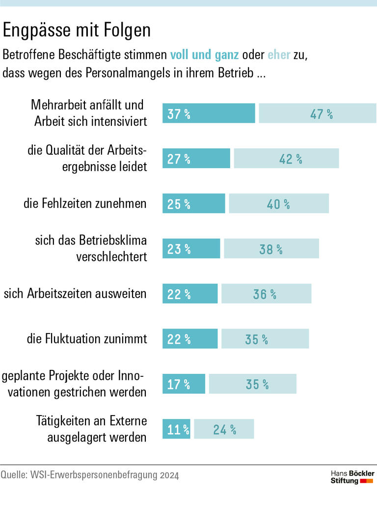 Personalengpässe wirken sich Ahlers zufolge sowohl betriebswirtschaftlich als auch auf die Arbeitsbedingungen aus. 93 Prozent der befragten Interessenvertretungen nennen als eine Konsequenz, dass Beschäftigte mehr arbeiten müssen. Nach Angabe von 60 Prozent der Betriebsräte und 67 Prozent der Personalräte können betriebliche Pläne nicht umgesetzt, laut 26 beziehungsweise 47 Prozent Aufträge nicht erfüllt werden. Von den betroffenen Erwerbspersonen stimmen 37 Prozent der Aussage voll und ganz zu, dass Mehrarbeit und Arbeitsintensität durch den Personalmangel zunehmen. 27 Prozent bestätigen, dass die Qualität der Arbeitsergebnisse leidet, 25 Prozent, dass die Fehlzeiten zunehmen, 23 Prozent, dass das Betriebsklima sich verschlechtert.