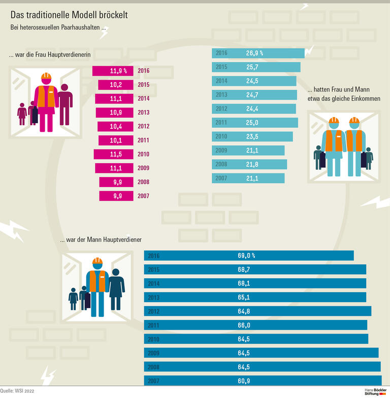 In zwei Dritteln der Haushalte verdienten die Männer mehr, ein knappes Viertel waren Haushalte „mit egalitärer Einkommenserwirtschaftung“. Die Grundgesamtheit bilden alle heterosexuellen Paarhaushalte – mit oder ohne Kinder. Als Familienernährer oder -ernährerin gilt, wer 60 Prozent oder mehr zum Haushaltseinkommen beiträgt. Kapitalerträge oder Sozialtransfers, die nicht unmittelbar einer Person zugeordnet werden können, bleiben außen vor.