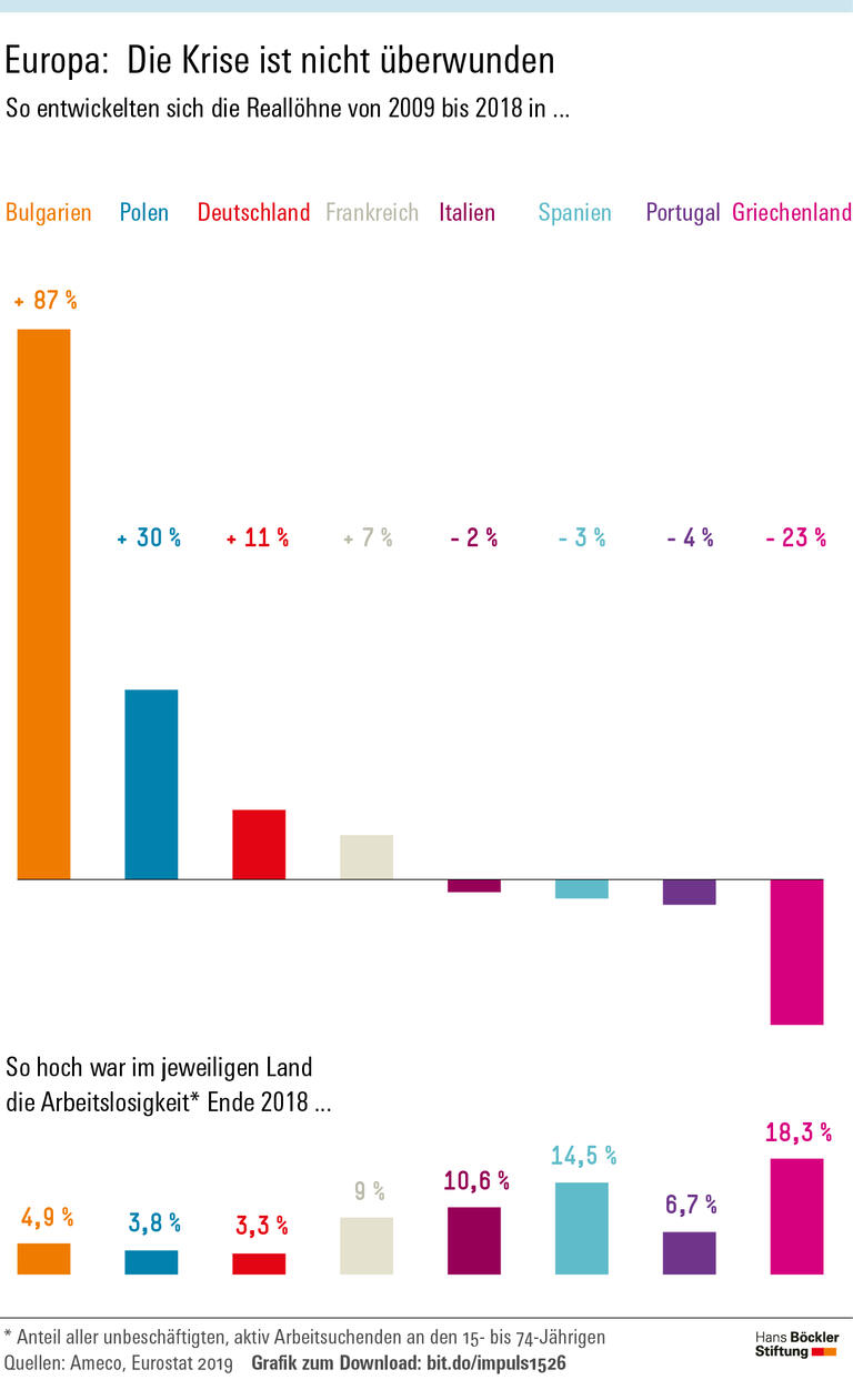 Die jüngste Finanzkrise ist nicht ausgestanden. Darauf macht das Europäische Gewerkschaftsinstitut ETUI in seinem jüngsten Report zur Lage der Arbeitnehmer in Europa aufmerksam. Zwar sei die Zahl der Beschäftigten im Durchschnitt wieder beim Vorkrisenniveau angelangt. Allerdings habe sich die Qualität der Arbeit vielerorts deutlich verschlechtert. An die Stelle sozial abgesicherter Standardarbeitsplätze seine häufig Zeitarbeit, Jobs mit geringer Stundenzahl, Auftrags- oder Plattformarbeit getreten. Lohnungleichheit und Armut trotz Arbeit haben zugenommen. In zehn Mitgliedsstaaten liegen die Reallöhne heute niedriger oder genauso hoch wie 2009. In 15 Ländern hinken die Löhne der Produktivitätsentwicklung hinterher. Das heißt, Arbeitnehmer „bekamen keinen fairen Anteil am Wohlstand, den sie zu erzeugen geholfen haben“, so die Untersuchung.