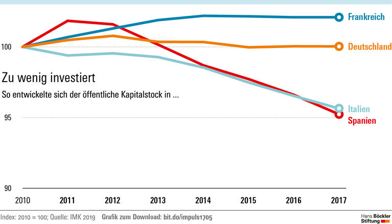 Die öffentlichen Investitionen spielen für die wirtschaftliche Entwicklung eine entscheidende Rolle. Allerdings sieht es in Europa recht mau aus, was Ausgaben für Schienen, Straßen und Schulen angeht. Netto, also abzüglich des Wertverfalls durch Abnutzung, liegen sie in Deutschland und Frankreich seit einigen Jahren nahe Null. In Italien und Spanien schrumpft der sogenannte öffentliche Kapitalstock sogar. Insgesamt liegen die staatlichen Investitionen in der Währungsunion heute rund 20 Prozent unter dem Wert von 2009. Eine Folge der Sparpolitik, die mit Instrumenten wie Schuldenbremse und Fiskalpakt zur höchsten wirtschaftspolitischen Maxime erhoben wurde.