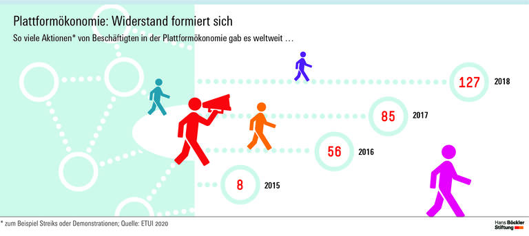 In verschiedenen Ländern haben Crowdworker und Plattformarbeiter bereits kollektive Aktionen organisiert. Für Aufsehen sorgte vor einigen Jahren der Streik von Essenskurieren bei Deliveroo in London. Der Lieferdienst hatte angekündigt, er wolle seine „Rider“ nicht mehr nach Stundenlohn, sondern nach Akkord bezahlen, was für die Fahrer zu erheblichen Einbußen geführt hätte. Daraufhin versammelten sich rund 150 Fahrer vor der Zentrale von Deliveroo und legten den Betrieb lahm, indem sie sich gemeinsam von ihren Konten abmeldeten. Darüber hinaus wurden in der ganzen Stadt fliegende Streikposten organisiert. Die Aktionen erregten große öffentliche Aufmerksamkeit. Eine Finanzierungskampagne trug dazu bei, die Lohnausfälle auszugleichen. Nach sechs Tagen gab sich Deliveroo geschlagen. Auch in anderen Ländern waren Kuriere in den vergangenen Jahren sehr aktiv. In Köln wählten Fahrer von Foodora, die im Gegensatz zu vielen ihrer Kollegen bei anderen Lieferdiensten fest angestellt waren, im Sommer 2017 einen ersten Betriebsrat. Die Konflikte der gewerkschaftsnahen Betriebsratsmitglieder mit dem Management des Unternehmens, das inzwischen von Lieferando übernommen wurde, sind bis heute nicht beigelegt.