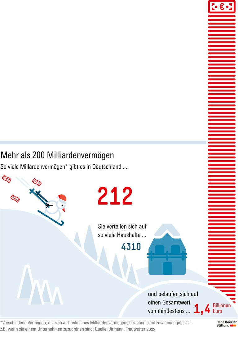 Der gesamte Wert der Milliardenvermögen hierzulande könnte statt rund 900 Milliarden Euro mindestens 1,4 Billionen Euro betragen, möglicherweise sogar deutlich mehr. Das entspricht gut einem Drittel bis der Hälfte des deutschen Bruttoinlandsprodukts. Zu diesem Ergebnis kommt eine Studie von Julia Jirmann und Christoph Trautvetter von der Nichtregierungsorganisation Netzwerk Steuergerechtigkeit, gefördert von der Hans-Böckler-Stiftung. Demnach gibt es in Deutschland nicht nur mehr Milliardenvermögen als in Forschung, Medien und Öffentlichkeit angenommen. Auch sind die bereits bekannten Supervermögen in bisherigen Analysen teilweise unterschätzt worden, etwa weil Gewinnausschüttungen nicht vollständig erfasst wurden oder der Wert von Unternehmensanteilen oder Immobilien zu niedrig veranschlagt wurde.