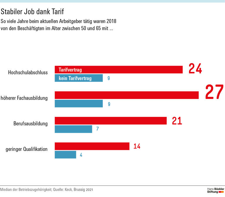 In Betrieben mit Tarifvertrag sind die Arbeitsverhältnisse laut Altersübergangsreport deutlich stabiler: Hier kommen Ältere auf eine mittlere Beschäftigungsdauer von 14 Jahren bei geringqualifizierter Arbeit und 24 Jahren bei Berufen mit Hochschulabschluss. Bei der Hälfte der älteren Beschäftigten, die ohne Tarifvertrag arbeiten, beträgt die Betriebszugehörigkeit im Schnitt nur vier beziehungsweise neun Jahre. Hinzu kommt: Wenn ältere Beschäftigte in Betrieben mit Tarifvertrag neu eingestellt werden, dann sind sie zwar zunächst häufig befristet oder in Leiharbeit beschäftigt. Sie haben aber bessere Chancen, im Anschluss in ein Normalarbeitsverhältnis zu wechseln. Anders sieht es ohne Tarifvertrag aus: Hier arbeiten Beschäftigte häufig in Minijobs. Ihre Chance, in eine Normalarbeit zu wechseln, ist gering.
