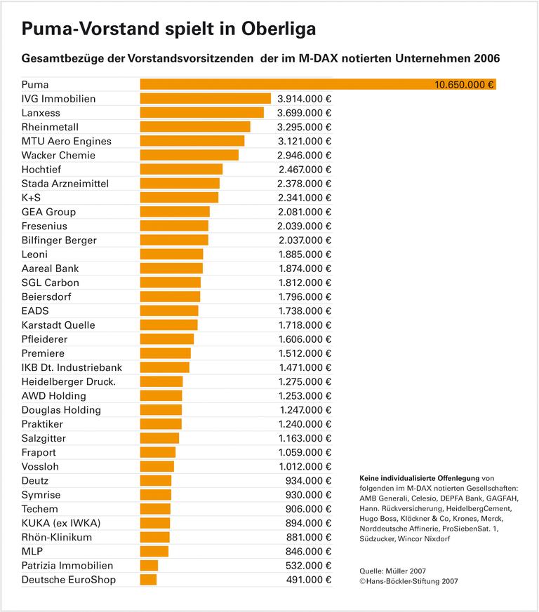 Im Schnitt liegen die Bezüge der M-DAX-Vorstandschefs bei zwei Millionen Euro, 28 der Spitzenmanager sind Vergütungsmillionäre, hat Matthias Müller auf Grundlage der Veröffentlichungen in den Geschäftsberichten ermittelt. Der Experte bezog in seine Auswertung neben fixem Gehalt und Leistungs-Boni auch Aktienoptionen und Pensionsaufwendungen mit ein. Die Spanne bei den Vergütungen fällt beträchtlich aus: Während bei der Deutschen Euroshop AG 491.000 Euro gezahlt wurden, waren es bei der Puma AG knapp 10,7 Millionen Euro.