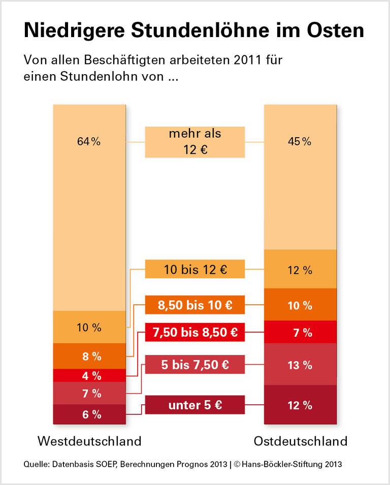 Besonders ostdeutsche Arbeitnehmer würden von der Einführung eines allgemeinen Mindestlohns profitieren. Hier verdienen 32 Prozent der Beschäftigten weniger als 8,50 Euro pro Stunde, während dies im Westen auf 17 Prozent der Arbeitnehmer zutrifft. Wie das Wirtschaftsforschungsunternehmen Prognos im Auftrag der Hans-Böckler-Stiftung auf Basis des Sozio-oekonomischen Panels errechnet hat, würde ein Mindestlohn nicht nur die Verdienste im Osten, sondern auch das dortige Rentenniveau überdurchschnittlich ansteigen lassen. Der aktuelle Rentenwert Ost würde durch die Einführung eines gesetzlichen Mindestlohns in Höhe von 8,50 Euro für das Jahr 2012 gemessen am Westniveau um rechnerisch 2,8 Prozentpunkte steigen. Bei einem Mindestlohn von 10 Euro würde die Annährung an den Westen zusätzlich 2 Prozentpunkte betragen. Der Abstand zwischen Ost- und Westrenten würde sich damit deutlich verringern. Allerdings sind mögliche Beschäftigungseffekte von Mindestlöhnen in der Berechnung nicht berücksichtigt.