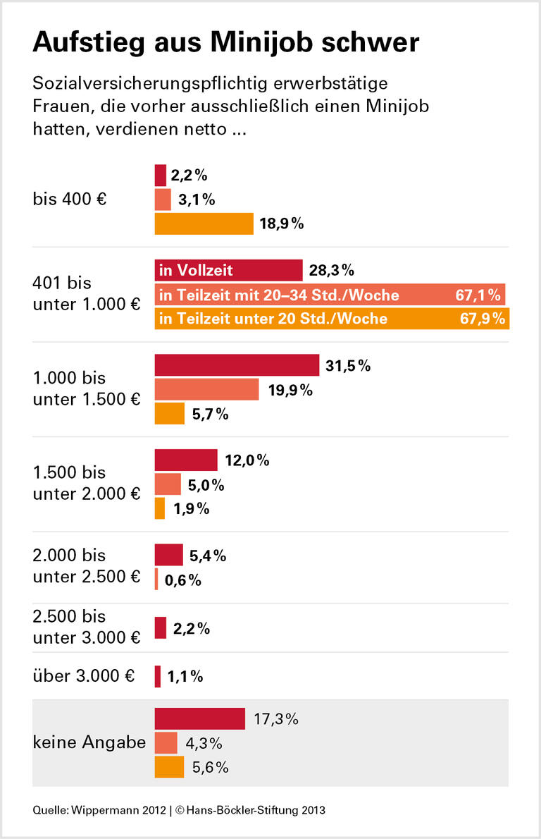 Späteres Einkommen. Minijobberinnen haben zwar in der Regel eine fundierte Berufsqualifikation, so Wippermann. Dennoch werden sie in der Regel nicht mehr als qualifizierte Fachkraft wahrgenommen. Damit ist ihre Verhandlungsposition in späteren Einstellungsgesprächen schlechter als die vergleichbarer Bewerber – sollten sie zu den 40 Prozent gehören, die den Weg zurück in eine sozialversicherungspflichtige Beschäftigung überhaupt schaffen. Knapp zwei Drittel der Frauen, die vorher ausschließlich in einem Minijob gearbeitet haben, erhalten in ihrem neuen, sozialversicherungspflichtigen Job ein Nettoeinkommen unter 1.000 Euro. Das gilt sogar für gut 28 Prozent der Vollzeit-Beschäftigten. Insgesamt muss knapp jede Zehnte mit einem Einkommen unter 400 Euro auskommen.