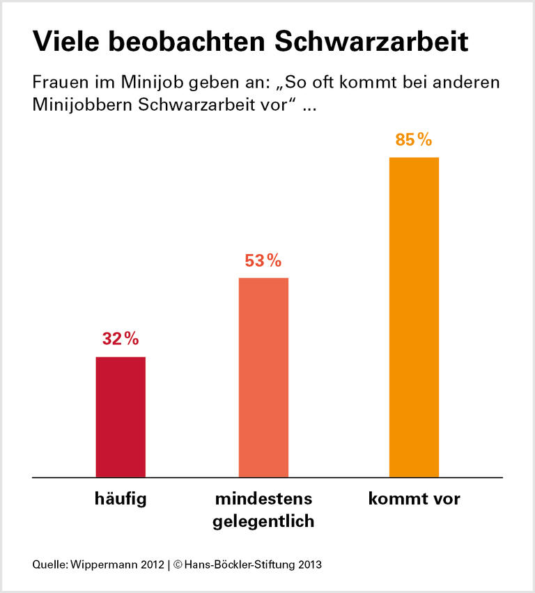 Schwarzarbeit. „Minijobs sind immer noch besser als schwarz arbeiten.“ Dieser Aussage stimmten 94 Prozent der ausschließlich geringfügig Beschäftigten zu. Dennoch kam bei qualitativen Gruppengesprächen heraus, dass für einen Großteil der Minijobberinnen Schwarzarbeit „selbstverständlich und an der Tagesordnung“ ist. „Schwarzarbeit hat unter den Beschäftigten in Minijobs weniger den Charakter eines ‚Kavaliersdelikts‘, sondern gilt als Ausweis von Engagement, Flexibilität und Vertrautheit mit dem Arbeitgeber – und ist nahezu eine soziale Norm“, hat der Soziologe beobachtet. „Wer diese nicht nutzt oder sich dieser gar verweigert, ist dumm oder verdächtig.“