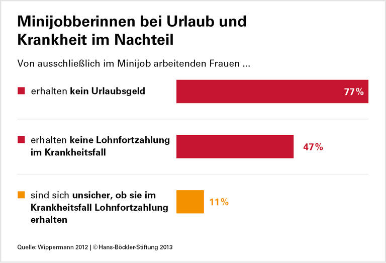 Arbeits- und sozialrechtliche Leistungen. Urlaubsgeld, Lohnfortzahlung im Krankheitsfall, bezahlte Überstunden – auf all diese Leistungen haben auch Minijobberinen einen gesetzlichen Anspruch. Vielen werden diese Rechte jedoch vorenthalten, zeigen die Befragungsergebnisse. Sehr vielen Frauen in Minijobs sind die gesetzlichen Regelungen nicht bekannt, sie werden von ihnen nicht eingefordert oder ihnen verweigert, hat der Soziologie-Professor ermittelt.