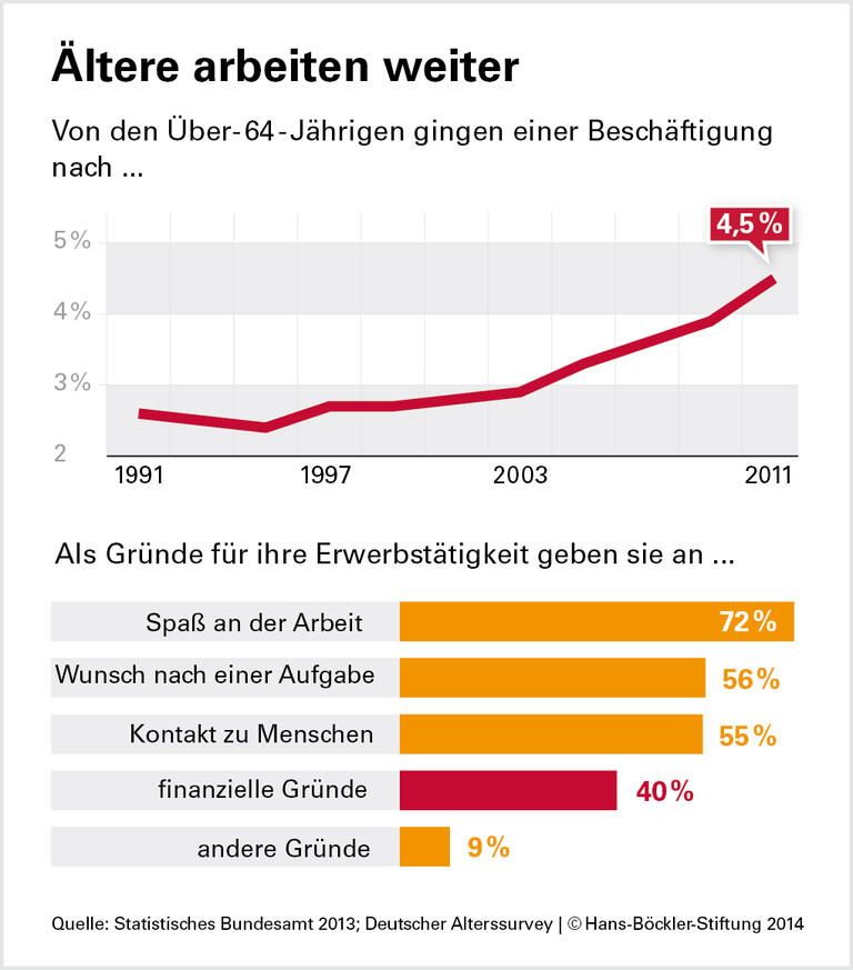 In den vergangenen zwanzig Jahren hat sich die Beschäftigungsquote der 65-Jährigen und Älteren nahezu verdoppelt, wie eine Analyse des Instituts Arbeit und Qualifikation (IAQ) an der Universität Duisburg-Essen zeigt. So hatten 2011 etwa 763.000 Über-64-Jährige einen Job – 13 Prozent mehr als im Jahr zuvor. Ein Drittel von ihnen bestreitet den Lebensunterhalt vorwiegend mit der Erwerbstätigkeit, für die anderen ist ihre Rente die Haupteinnahmequelle.