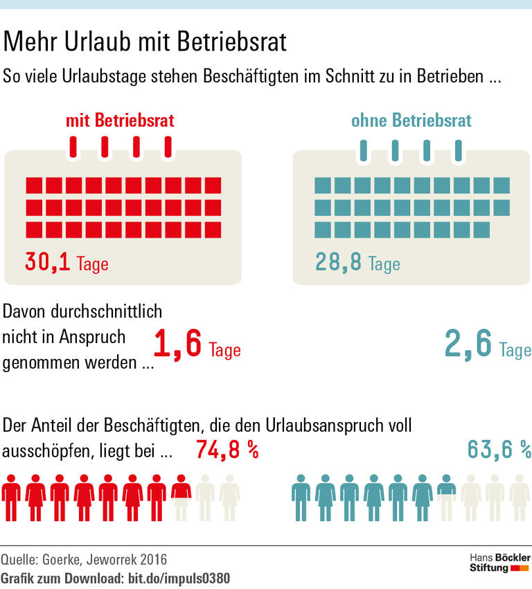 Der empirischen Analyse zufolge gibt es bei der Inanspruchnahme von Urlaub tatsächlich systematische Unterschiede zwischen Firmen mit und ohne Mitbestimmung: Beschäftigte von mitbestimmten Betrieben lassen im Schnitt 1,6 Urlaubstage pro Jahr ungenutzt, andere Beschäftigte 2,6 Tage. Die Wahrscheinlichkeit, dass der Jahresurlaub komplett genommen wird, ist 11,2 Prozentpunkte höher, wenn es eine Arbeitnehmervertretung gibt. Auch wenn Faktoren wie die Zahl der vertraglich vereinbarten Urlaubstage, die Betriebsgröße, das Alter, die Qualifikation oder das Geschlecht der Arbeitnehmer herausgerechnet werden, ergibt sich ein signifikanter Effekt: Beschäftigte mit Betriebsrat nehmen durchschnittlich einen Tag mehr frei. Besonders stark kommt der Effekt bei Kleinbetrieben zum Tragen – und bei Männern. Deren Auszeit erhöht sich um etwa zwei Tage. Arbeitnehmerinnen scheinen ihre Ansprüche dagegen auch ohne Betriebsrat weitgehend auszuschöpfen. Der Vorteil insbesondere für männliche Beschäftigte sei ökonomisch durchaus beachtlich, so Goerke und Jeworrek. Bei 200 Arbeitstagen im Jahr entsprächen zwei zusätzliche Urlaubstage einer Arbeitszeitverkürzung um ein Prozent oder einem Lohnplus in gleicher Höhe.
