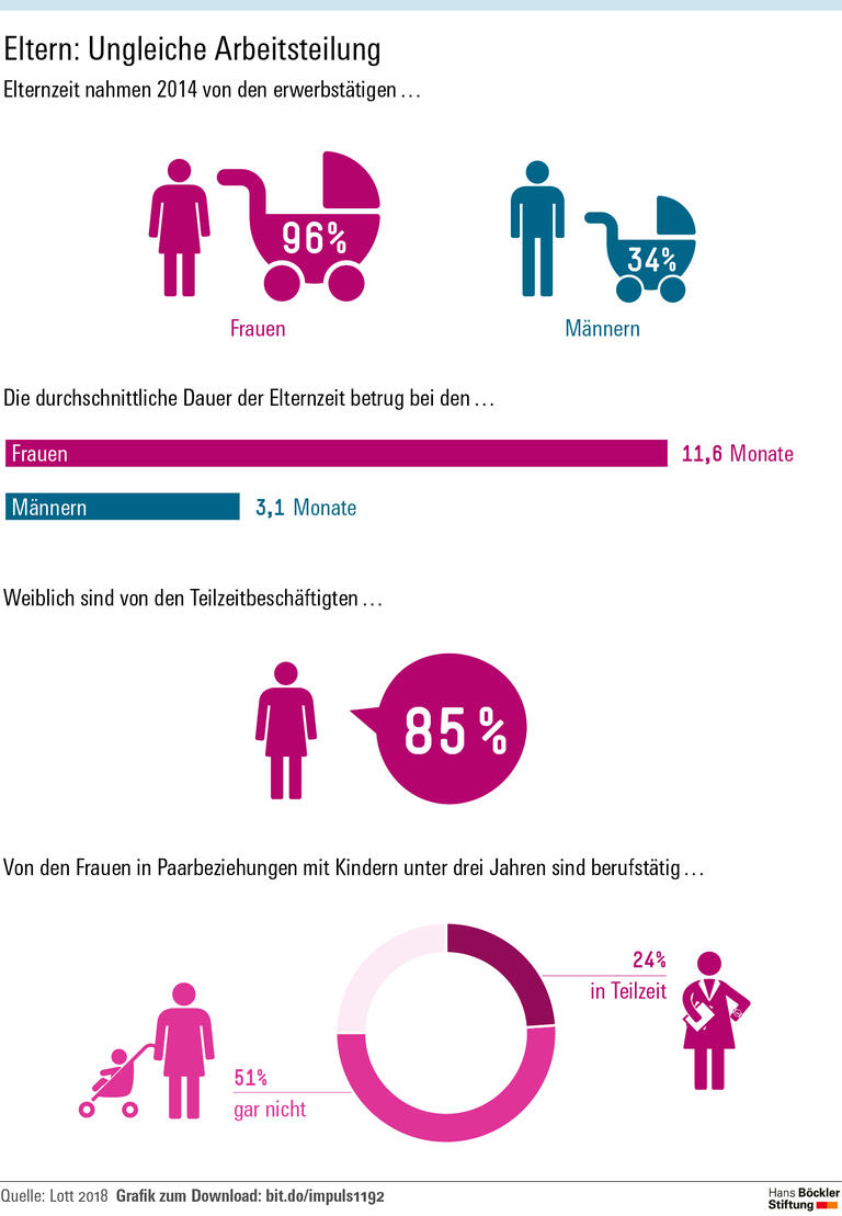 Dass Mütter auf dem Arbeitsmarkt nach wie vor benachteiligt sind, liegt der Studie zufolge auf der Hand. Arbeitnehmerinnen gehen demnach zu 96 Prozent und meistens für zwölf Monate in Elternzeit, Männer nur zu einem Drittel und in der Regel zwei Monate. Die Erwerbsbeteiligung von Frauen habe in den vergangenen Jahren überwiegend in Form von Teilzeitjobs zugenommen, aktuell seien über vier Fünftel der betroffenen Beschäftigten weiblich. Von den Müttern mit Kindern unter drei Jahren arbeite knapp ein Viertel in Teilzeit, die Hälfte sei überhaupt nicht erwerbstätig.