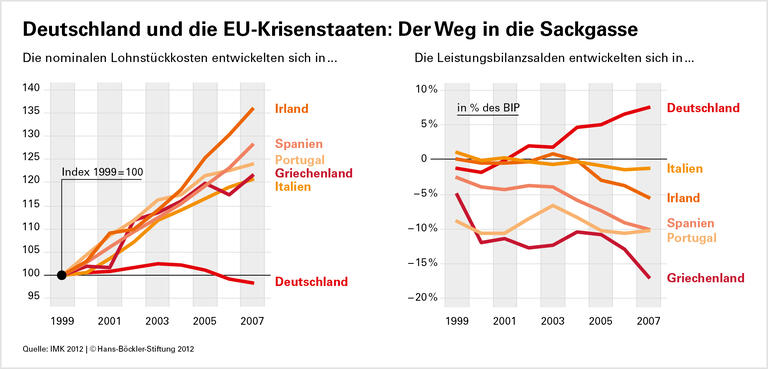 Zudem „liegen der gegenwärtigen Krise nicht primär die hohe Staatsverschuldung zugrunde, sondern Leistungsbilanzdefizite“, so die Analyse der Wirtschaftswissenschaftler. Stark unterschiedliche Leistungsbilanzsalden deuteten unabhängig vom Vorzeichen auf sich anbahnende Zahlungsbilanzprobleme hin: auf eine übermäßige Verschuldung des Privatsektors oder des Staats im Ausland beziehungsweise auf einen übermäßigen Aufbau von Forderungen gegenüber dem Ausland.