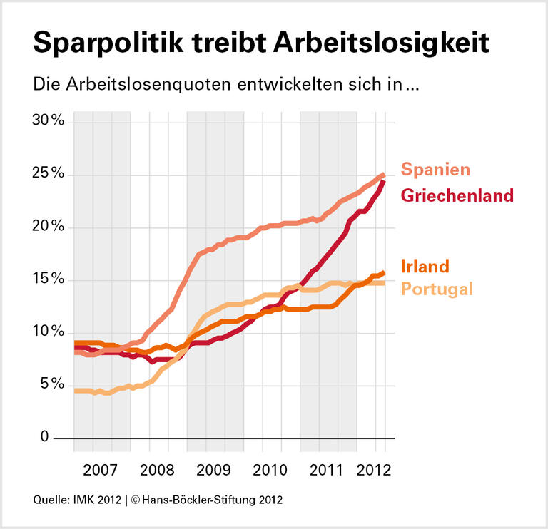 Da die Geldpolitik Eurolands im Grundsatz einheitlich ist, ist zur Bewältigung der länderspezifischen Probleme in erster Linie die Fiskalpolitik gefordert, erläutert das IMK. In Defizitländern wie Griechenland oder Spanien müsse die Fiskalpolitik restriktiver ausgerichtet werden, wenn sich keine Besserung der Außenhandelsposition einstellt – zum Beispiel über höhere Steuern.