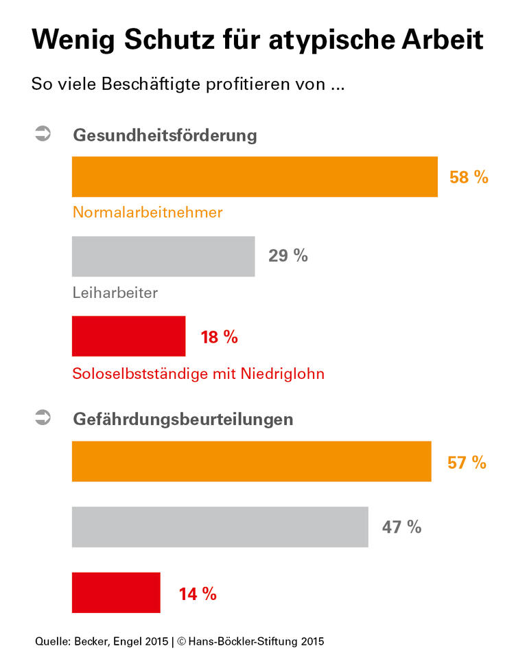 Dass Beschäftigungsform und Gesundheitsschutz eng zusammenhängen, können die Forscher anhand von Daten des Bundesinstituts für Berufsbildung und der Bundesanstalt für Arbeitsschutz und Arbeitsmedizin belegen. Nach ihren Berechnungen sinken die Standards mit wachsendem Abstand zum Normalarbeitsverhältnis. Von den befragten Erwerbstätigen mit unbefristetem Vollzeitjob geben 57 Prozent an, dass ihr Betrieb Gefährdungsbeurteilungen durchführt, 58 Prozent berichten von Gesundheitsförderung. Bei Teilzeit- oder befristet Beschäftigten sind es jeweils 43 Prozent. Beschäftigte, die in mindestens drei Kriterien vom Normalarbeitsverhältnis abweichen – zum Beispiel Geringverdiener mit Teilzeit und Befristung – kommen zu 32 Prozent in den Genuss von Gefährdungsbeurteilungen, nur 21 Prozent haben Zugang zu Gesundheitsförderung. Noch schlechter sehen die Werte bei Soloselbstständigen mit Niedriglohn aus.