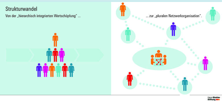 Unternehmen wandeln sich zu „pluralen Netzwerkorganisationen“. Sie stellen ihre Produkte nicht mehr selbst her, sondern koordinieren komplexe Geflechte aus Zulieferern und Dienstleistern. Das gilt nicht nur für die Unternehmen des digitalen Kapitalismus wie Google, Apple oder Amazon, sondern zunehmend auch für Firmen aus traditionellen Branchen, erläutern Markus Helfen und Carsten Wirth, die für die Hans-Böckler-Stiftung den aktuellen Forschungsstand zu neuen Entwicklungen in der Organisation der Wertschöpfung aufbereitet haben.