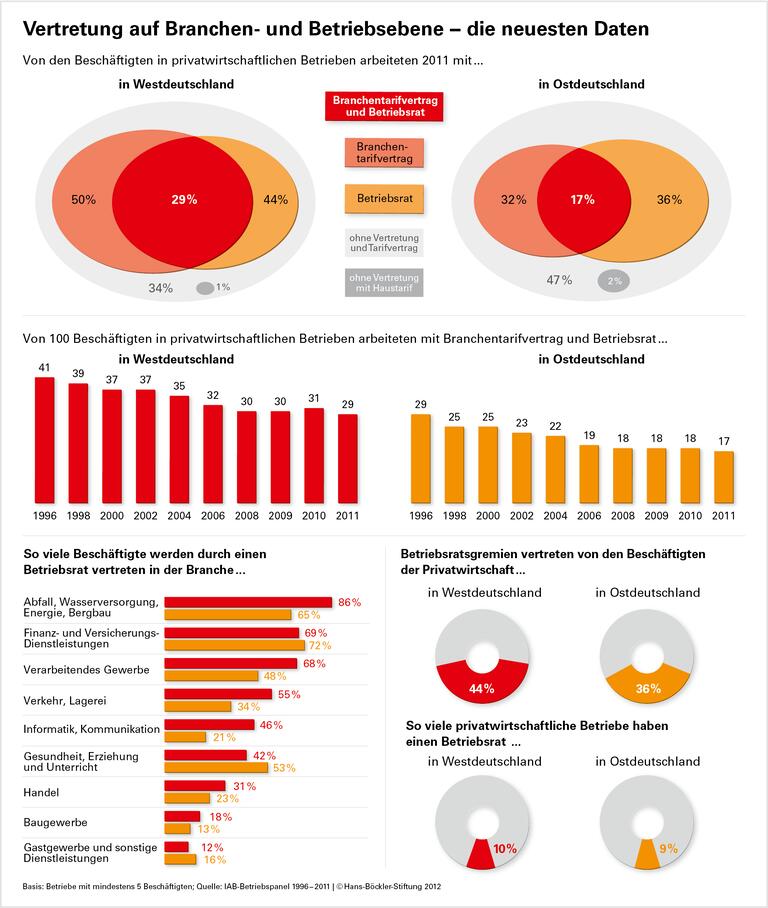 Das Institut für Arbeitsmarkt- und Berufsforschung (IAB) erhebt jährlich, wie weit dieses System der dualen Vertretung reicht. 2011 waren es in Westdeutschland 29 Prozent der Beschäftigten privater Betriebe ab fünf Mitarbeitern, die sowohl einen Betriebsrat hatten als auch nach einem Flächentarif bezahlt wurden. Im Osten galt dies für 17 Prozent. Betriebliche Mitbestimmung und Branchentarifbindung haben seit Beginn der Erhebungen 1996 Terrain eingebüßt. Wobei Großbetriebe nach wie vor zu über 90 Prozent einen Betriebsrat haben. Und auch wenn die Reichweite der Branchentarife nachgelassen hat, haben Flächentarifverträge dem IAB zufolge weiterhin große Bedeutung. Denn auch nicht tarifgebundene Unternehmen zahlen zu über 40 Prozent in Anlehnung an den jeweiligen Branchentarif.