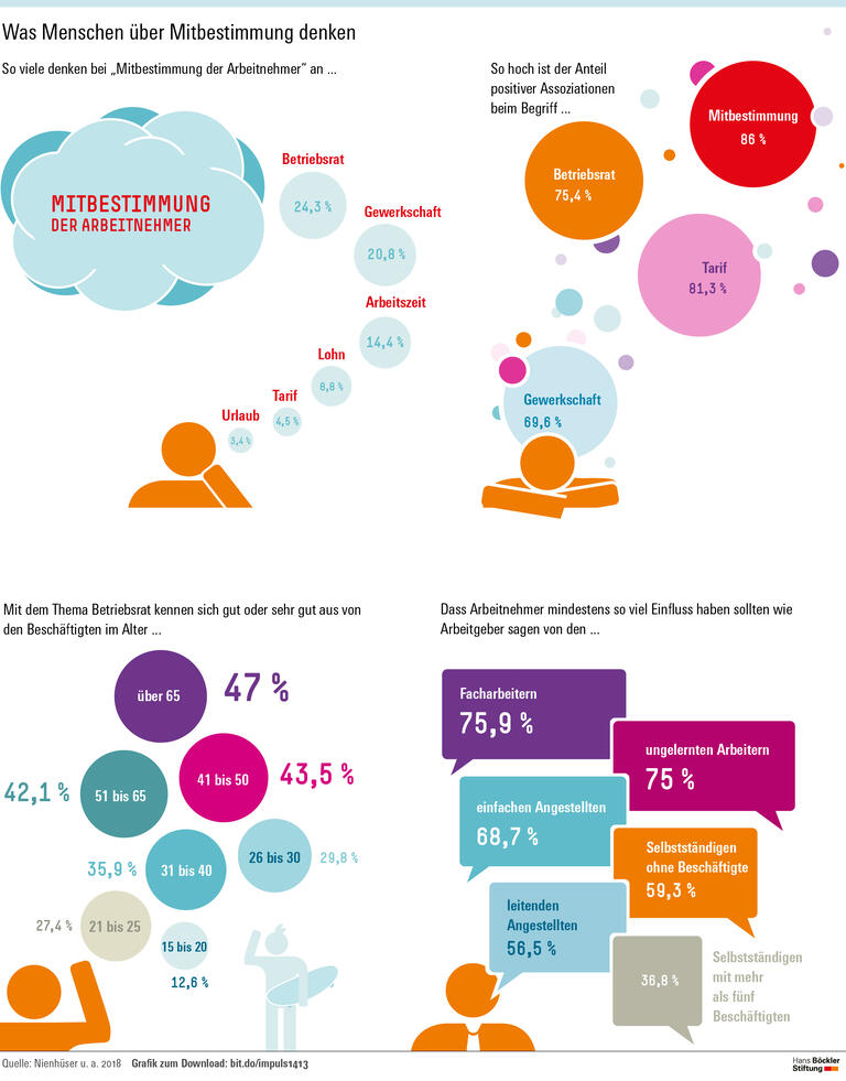 „Die Mehrheit der Bevölkerung, dafür sprechen unsere Befunde sehr deutlich, hat bereits eine positive Einstellung zur Mitbestimmung in einem generellen Sinne“, schreiben die Wissenschaftler. Der Begriff Mitbestimmung könne – ähnlich wie etwa Demokratie oder Gerechtigkeit – als ein „Hochwertwort“ verstanden werden, als ein Begriff, bei dem sich positive Assoziationen geradezu von selbst aufdrängen. Was allerdings fehlt, sei das Wissen: über konkrete Mitbestimmungsrechte, ihre alltägliche Praxis und ihre Folgen sowie darüber, was Mitbestimmung für die Erreichung der gemeinsamen und der eigenen Interessen bedeutet.