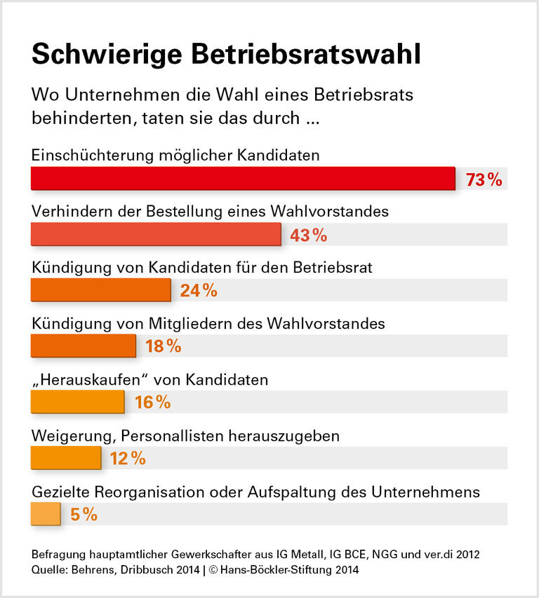 Besonders häufig seien Versuche, Kandidaten für die Betriebsratswahl einzuschüchtern, stellen die Forscher fest. Gerade in kleinen und mittelgroßen Betrieben, in denen der Kontakt zwischen Eigentümer, Management und Beschäftigten oft eng sei, ließen sich Kandidaten leicht unter Druck setzen. Im Durchschnitt beobachteten diese Taktik 73 Prozent der Befragten in jenen Betrieben, in denen die Wahl behindert wurde, im Fachbereich Handel von ver.di sogar 86 Prozent. Auch die Gewährung von Vorteilen für den Fall, dass Arbeitnehmer ihre Kandidatur zurückziehen, kommt im Handel häufiger vor als in anderen Branchen.