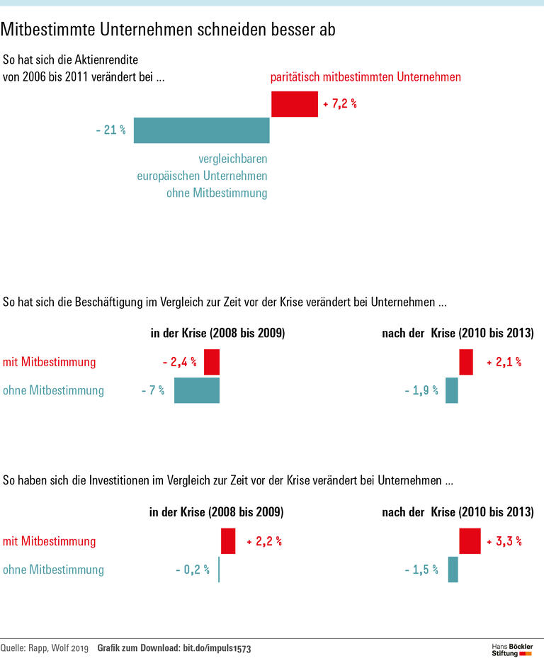 Unternehmen, bei denen Arbeitnehmervertreter im Aufsichtsrat sitzen, haben sich seit der großen Finanz- und Wirtschaftskrise besser entwickelt als Firmen ohne Mitbestimmung. Das gilt für die operative Rendite, die Bewertung am Kapitalmarkt, die Beschäftigungsentwicklung sowie für die Investitionen in Anlagen und Forschung. So lag zum Beispiel die kumulierte Aktienrendite mitbestimmter Unternehmen zwischen 2006 und 2011 um 28 Prozentpunkte höher als bei vergleichbaren Firmen ohne Arbeitnehmerbeteiligung. Zu diesem Ergebnis kommt eine neue Studie von Marc Steffen Rapp von der Universität Marburg und Michael Wolff von der Universität Göttingen.