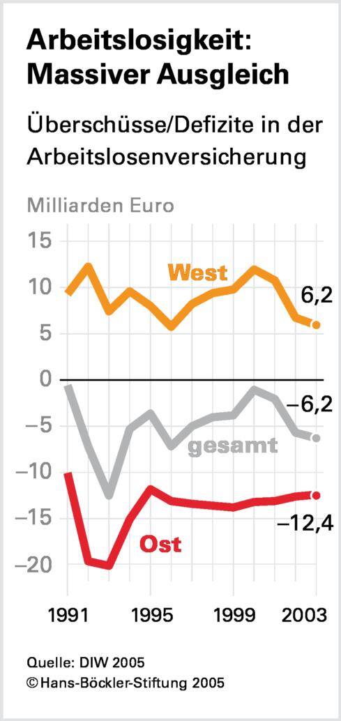 Auch bei der Arbeitslosenversicherung werden die Beitragsüberschüsse im Westen genutzt, um die Unterdeckung durch Beiträge im Osten abzudecken. Auf 12,4 Milliarden Euro taxiert das DIW diese Unterdeckung. Einen erheblichen Anteil an diesen Ausgaben hat dabei nicht einmal die unmittelbare Unterstützung für die Arbeitslosen: Rund die Hälfte dessen, was die Arbeitsämter in Ostdeutschland ausgeben, entfällt auf Eingliederung und Arbeitsförderung.