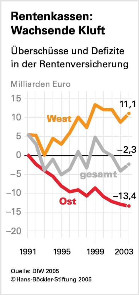 In zwei Bereichen wandern Jahr für Jahr Milliarden-Beträge ostwärts: in der Renten- und in der Arbeitslosenversicherung. Das DIW stuft diese Leistungen als "versicherungsfemd" ein (siehe dazu auch ). Wohlgemerkt: Das Institut spricht sich nicht dafür aus, diese Leistungen zu verringern oder gar abzuschaffen - sondern sie über Steuern zu finanzieren, weil diese Ausgaben in der Sozialversicherung nichts zu suchen haben.