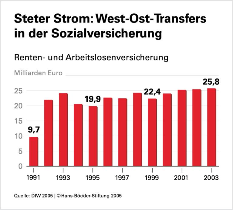 Auf 25,8 Milliarden Euro hat das Deutsche Institut für Wirtschaftsforschung (DIW) Transfers der Sozialversicherung von West nach Ost für das Jahr 2003 berechnet. Wenn es gelänge, diese Summe über Steuern statt über Sozialversicherungsbeiträge aufzubringen, ließen sich die Beitragssätze um ungefähr drei Beitragspunkte senken.