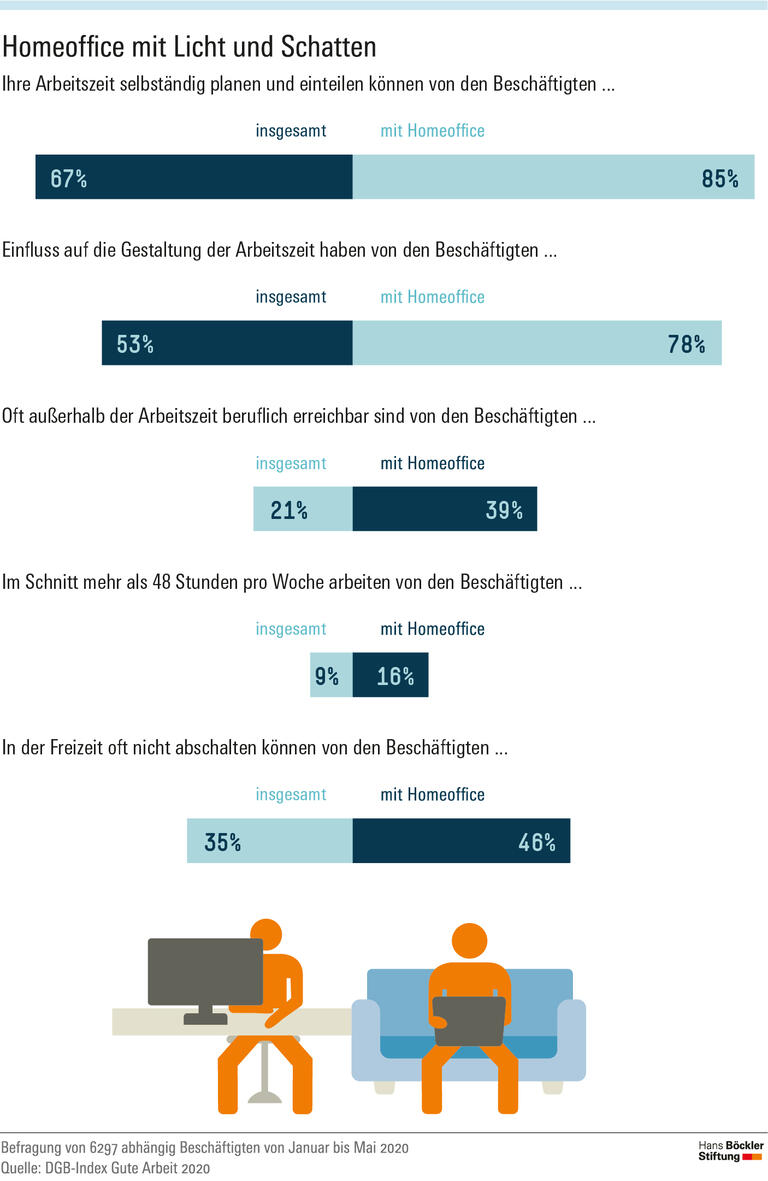 Dem stehen allerdings auch Nachteile gegenüber: Die mobil Beschäftigten müssen häufiger außerhalb der Arbeitszeit erreichbar sein. Zudem arbeitet ein Sechstel von ihnen länger als 48 Stunden pro Woche, andere Beschäftigte nur zu 6 Prozent. Auch unbezahlte Arbeit, verkürzte Ruhezeiten, und Probleme, von der Arbeit abzuschalten, kommen häufiger vor. Darüber hinaus zeigt sich, dass mobil Arbeitende überdurchschnittlich oft Probleme mit der Vereinbarkeit von Beruf und Privatleben haben – selbst dann, wenn sie im Homeoffice tätig sind. Dem Report zufolge dürfte dafür vor allem die vergleichsweise hohe Arbeitsbelastung verantwortlich sein.