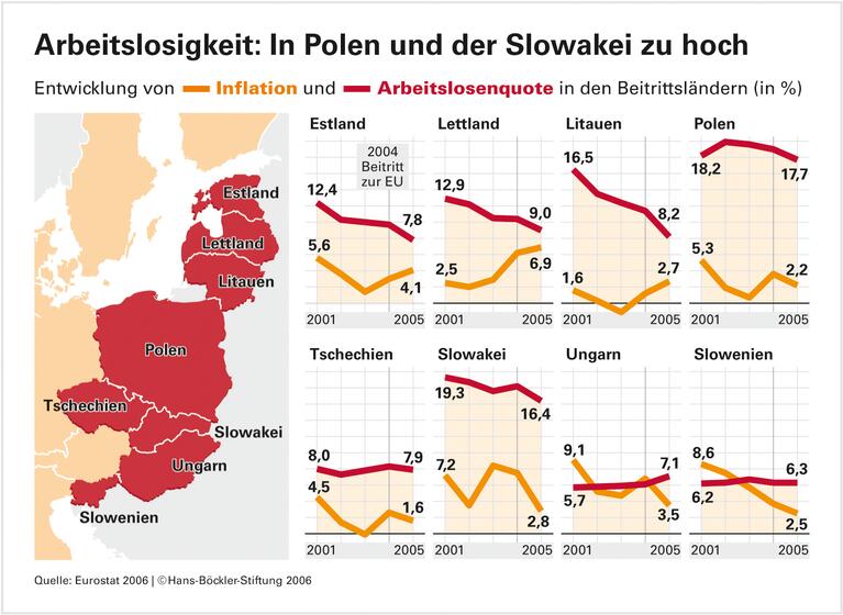 Was die zu niedrige Teuerungsrate eines großen Mitgliedslandes anrichten kann, zeigt Deutschland anschaulich: Seit Beginn der Währungsunion liegt die Inflation hier weit unter dem Durchschnitt der Länder. In keinem anderen Land des Euroraums war die Lohnzurückhaltung so stark wie in Deutschland. So stieg zwar die preisliche Wettbewerbsfähigkeit der deutschen Wirtschaft. Aber nicht ohne Gefahren: Auf Dauer kann sich der Lohndruck nach unten auf die anderen Länder übertragen. Das wäre nicht nur schlecht für die Arbeitnehmer, im gesamten Euroraum könnte das die Preise drücken. Mit der Folge einer Abwärtsspirale, die in Stagnation und Deflation mündet. In Sachen Arbeitslosigkeit wären die meisten EU-Neulinge allerdings fit für den Euro. Nur Polen und die Slowakei haben Arbeitslosenquoten weit über dem Schnitt der aktuellen Mitglieder der Währungsunion.