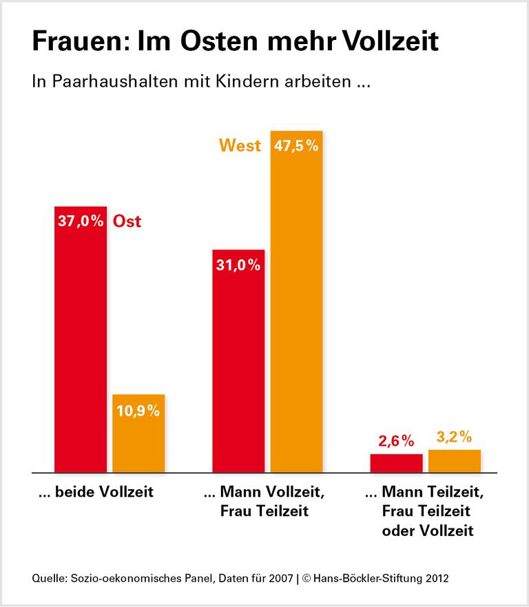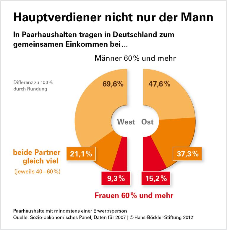 Die zunehmend bessere Arbeitsmarktintegration von Frauen erhöht die Wahrscheinlichkeit, dass sie ihrem Partner hinsichtlich ihrer beruflichen Position und damit auch ihres Einkommens überlegen sind. In Ostdeutschland, wo Frauenerwerbstätigkeit eine längere Tradition hat, ist in manchen Paaren die Frau höher qualifiziert als ihr Partner – entweder seit dem Beginn der Partnerschaft, etwa weil sie Akademikerin ist und er nicht, oder aufgrund eines erfolgreicheren beruflichen Aufstiegs der Frau. Auch Vollzeitarbeit ist im Osten unter Frauen weiter verbreitet als in Westdeutschland. Zudem liegt der Frauenanteil in Führungspositionen in Ostdeutschland höher als im Westen.