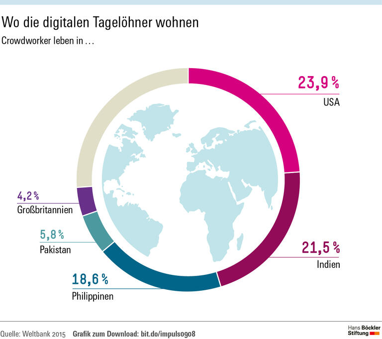 Das deutsche Recht weise insofern eine hilfreiche Besonderheit auf, als es mit der „arbeitnehmerähnlichen Person“, die zwar nicht persönlich, aber wirtschaftlich abhängig ist, eine Kategorie zwischen Arbeitnehmern und Selbstständigen kennt. Ein Manko: Den Betroffenen stehe nur ein kleiner Teil der üblichen Arbeitnehmerrechte zu; weder der Kündigungsschutz noch der Mindestlohn gelte für sie. Zudem seien Crowdworker typischerweise für mehrere Auftraggeber tätig.