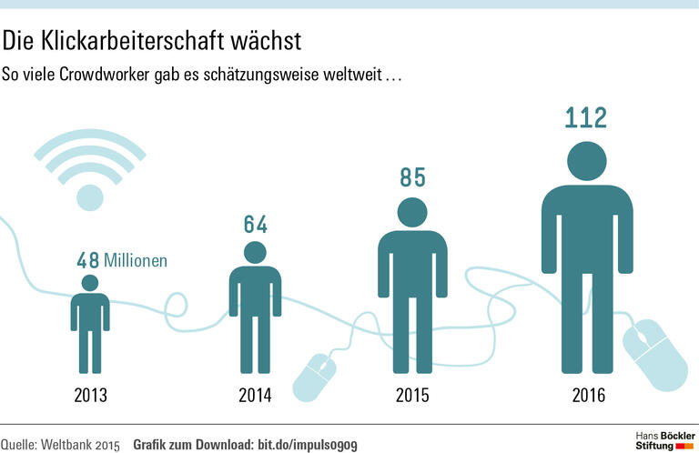 Der Markt für Crowdwork sei zuletzt deutlich gewachsen, schreibt der Jurist. Schätzungen zufolge waren 2013 weltweit 48 Millionen Personen bei entsprechenden Anbietern registriert, der Umsatz dürfte zwei Milliarden Dollar betragen haben. Für das Jahr 2020 rechnen Prognosen mit 15 bis 25 Milliarden Dollar. Zwei Drittel der Klickarbeiter kommen aus drei Ländern: den USA, Indien und den Philippinen. Doch auch in Deutschland gebe es deutliche Zuwächse, so Waas. Am größten sei die Nachfrage zurzeit in der Technologie- und Internetbranche. Angesichts der zunehmenden Verbreitung von Big Data sei aber davon auszugehen, dass andere Wirtschaftszweige nachziehen.