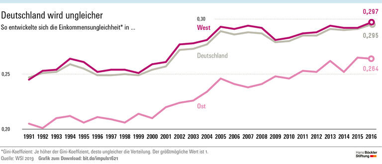 Der Verteilungsbericht beruht auf den aktuellsten Daten des Sozio-oekonomischen Panels (SOEP). Laut Spannagels Berechnungen lag der Gini-Koeffizient, der den Grad der Ungleichheit auf einer Skala von 0 bis 1 misst, Ende 2016 bei 0,295. Das entspricht einer Steigerung um 19 Prozent seit Ende der 1990er-Jahre und 2 Prozent seit 2005, dem Jahr, in dem die Ungleichheit einen vorläufigen Höhepunkt erreicht hatte. Während einige Ökonomen zu dem Fazit kommen, die Ungleichheit sei seit 2005 stabil geblieben oder sogar leicht gesunken, macht der WSI-Verteilungsbericht deutlich, dass es sich dabei lediglich um eine Momentaufnahme gehandelt hat. Der leichte Rückgang im Jahr 2009 beruhte demnach wesentlich darauf, dass die Kapitaleinkommen in der Finanzkrise kurzfristig einbrachen. Seit 2011 nimmt der Gini-Wert aber wieder zu. Dabei entwickeln sich die Einkommen in Ostdeutschland deutlich schneller auseinander als im Westen. Noch ist die Spreizung in den neuen Ländern allerdings geringer als in den alten.