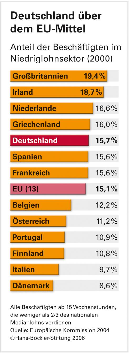 IAB: 3,9 Millionen Vollzeitbeschäftigte gehörten im Jahr 2001 zu den Geringverdienern, mehr als jeder Sechste oder 17,4 Prozent. Verdienstgrenze: 1.630 Euro brutto.