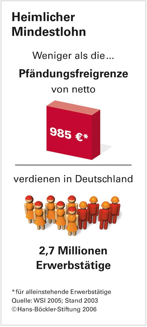 Als "heimlicher Mindestlohn", so Bispinck und sein Kollege Claus Schäfer*, wirkt die Pfändungsfreigrenze: netto 985 Euro (brutto 1.360 Euro) lässt der Gerichtsvollzieher dem einzelnen zum Leben.