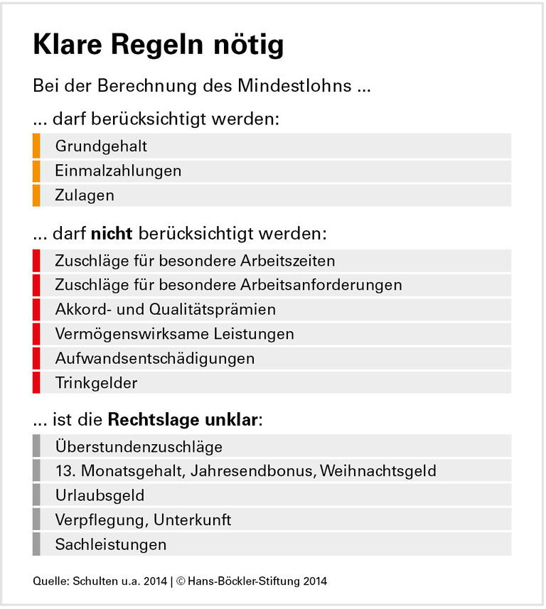 Transparente Vorschriften: Um überprüfen zu können, ob die künftige Lohnuntergrenze eingehalten wird, wären klare Vorgaben dafür nötig, wie die tatsächliche Lohnhöhe zu berechnen ist. Das Problem: In der vom Bundestag beschlossenen Regelung fehlt nach Analyse der Forscher eine solche präzise Definition. Wenn es darum geht, welche Einkommensbestandteile in die Kalkulation einfließen dürfen, verweist die Bundesregierung auf die Rechtsprechung des Bundesarbeitsgerichts und des Europäischen Gerichtshofs. Demnach dürfen Arbeitgeber nur das berücksichtigen, was sie für die vertraglich vereinbarte „Normalleistung“ zahlen. Das heißt: Tätigkeiten, die über das Normalmaß hinausgehen, sind extra zu vergüten. Das betrifft beispielsweise Zuschläge für Sonn- und Feiertagsarbeit, Gefahrenzulagen oder Trinkgelder. Dagegen herrsche Uneinigkeit darüber, wie mit Weihnachts- und Urlaubsgeld oder Verpflegung und Unterkunft umzugehen ist, monieren die Autoren. Für Unternehmen und Beschäftigte sei damit teilweise nicht nachvollziehbar, wer durch den Mindestlohn Anspruch auf eine Lohnerhöhung hat. Hier wäre nach der WSI-Analyse eine Klarstellung durch den Gesetzgeber angebracht.