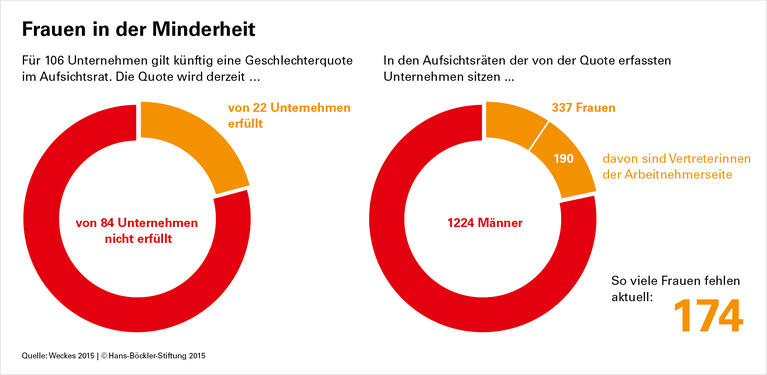 Die Geschlechterquote für Aufsichtsräte ist beschlossene Sache. Doch die 106 davon erfassten Firmen haben mehrheitlich großen Nachholbedarf: Nach derzeitigem Stand erfüllt nur gut ein Fünftel von ihnen die Quote, wie eine aktuelle Bilanz der Hans-Böckler-Stiftung zeigt.