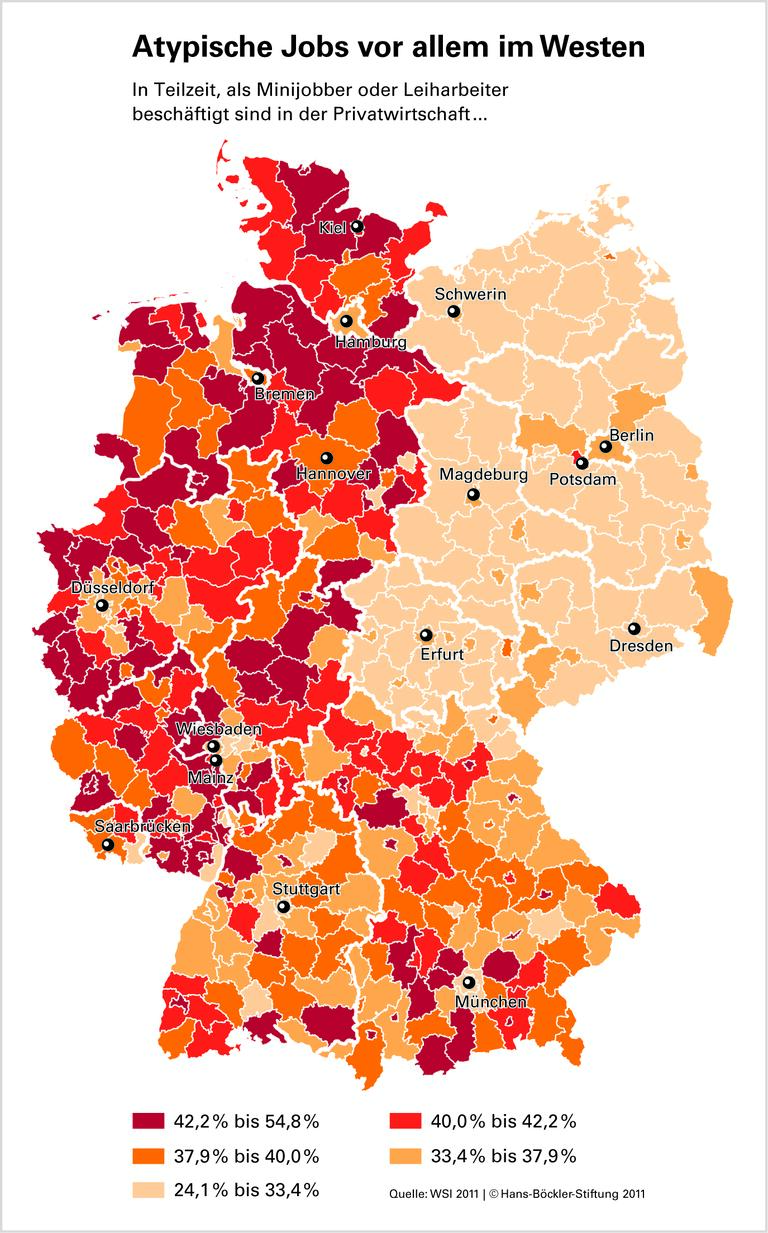Für Frauen gilt: Sogar über die Hälfte aller in der Privatwirtschaft Beschäftigten arbeitet atypisch. Auch hier finden sich die Spitzenreiter mit bis zu 70 Prozent im ländlichen Raum tief im Westen. Auffällig ist der überdurchschnittlich hohe Anteil an Minijobs. „Dies ist sehr bedenklich, weil Minijobber keine eigenständige Absicherung über die Sozialversicherungen haben und der Niedriglohnanteil unter den Minijobbern sehr hoch ist“, sagt der WSI-Forscher. Im Dienstleistungsbereich würden Minijobs häufig als staatlich legitimiertes Instrument zum Drücken der Löhne genutzt. „Mit ihrer Absicht, die Minijob-Verdienstgrenze auf 450 Euro anzuheben, verschärft die Regierung dieses Problem noch“, befürchtet Herzog-Stein.