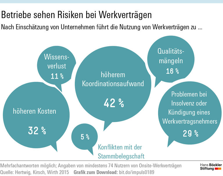 Die Unternehmer selbst verwiesen meist nur auf vordergründige Ausgaben, etwa die Entgelte für Beschäftigte. Häufig werde nicht einkalkuliert, dass sich bei Werkverträgen „zwangsläufig ein höherer Verwaltungsaufwand sowie rechtliche Risiken“ ergeben. Diese sogenannten Transaktionskosten stehen den vermeintlichen Ersparnissen gegenüber. Auch der Verlust von Kompetenzen, der sich durch die Auslagerung an Dritte ergibt, könne Konsequenzen haben; vor allem dann, wenn Kernbereiche des Geschäfts aus der Hand gegeben werden.