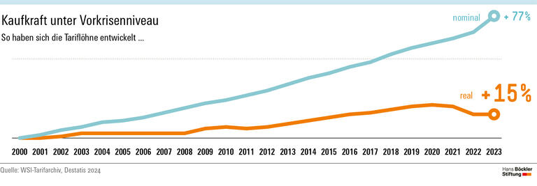 Die Tariflöhne sind 2023 um durchschnittlich 5,5 Prozent gestiegen – mehr als doppelt so stark wie im Vorjahr. Zusammen mit den vereinbarten Inflationsausgleichszahlungen konnten damit die Preissteigerungen des vergangenen Jahres zwar nahezu ausgeglichen werden. Um aber auch die Kaufkraftverluste früherer Jahre zu kompensieren, müssen die Reallöhne weiter zulegen. Schließlich liegen sie derzeit nur auf dem Niveau von Mitte der 2010er-Jahre. Nach Einschätzung des WSI-Tarifexperten Thorsten Schulten dürften die diesjährigen Tarifverhandlungen erneut von harten Auseinandersetzungen und Arbeitskämpfen geprägt sein.