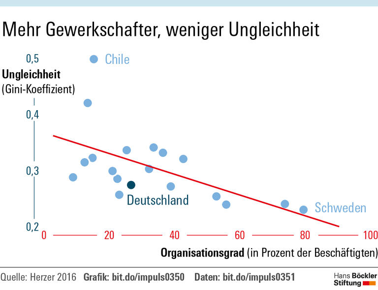 Gewerkschaften sorgen dafür, dass auch die Beschäftigten am unteren Rand der Firmenhierarchie anständig bezahlt werden. Dadurch verringern sich die Einkommensunterschiede in der Gesellschaft. Das sehen allerdings nicht alle Ökonomen so. Anhänger vollkommen unregulierter und flexibler Märkte argumentieren: Gewerkschaften heben das Lohnniveau ihrer Mitglieder über den Marktpreis, was zu weniger Beschäftigung führt. Das Ergebnis ist nach dieser Theorie mehr Arbeitslosigkeit – und damit mehr Ungleichheit. Der Wirtschaftswissenschaftler Dierk Herzer, Professor an der Helmut-Schmidt-Universität in Hamburg, hat empirisch untersucht, wer recht hat. Sein Ergebnis: „Länder mit geringerem Organisationsgrad tendieren zu höherer Ungleichheit“.