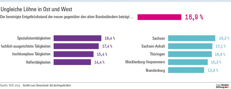 Auch fast 30 Jahre nach der Wiedervereinigung sind die Löhne in Ostdeutschland deutlich niedriger als in den alten Bundesländern. Insgesamt beträgt der Abstand rund 16,9 Prozent, wenn man Faktoren wie das Geschlecht, den Beruf oder die Berufserfahrung herausrechnet. Dies ergibt eine Auswertung von annähernd 175 000 Datensätzen des WSI-Portals Lohnspiegel.de.