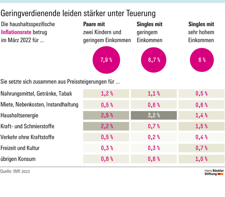 Ein Blick auf den IMK-Inflationsmonitor, der die Teuerung anhand repräsentativer Warenkörbe für neun verschiedene Haushaltstypen misst, zeigt, wen Preisschocks besonders treffen: Familien mit niedrigem Einkommen hatten im März 2022 eine Inflationsbelastung von 7,9 Prozent. Für Familien und Alleinerziehende mit zwei Kindern und mittlerem Einkommen betrug die Inflationsrate je 7,4 Prozent. Bei Alleinlebenden mit hohem Einkommen lag sie dagegen bei 6,0 Prozent.