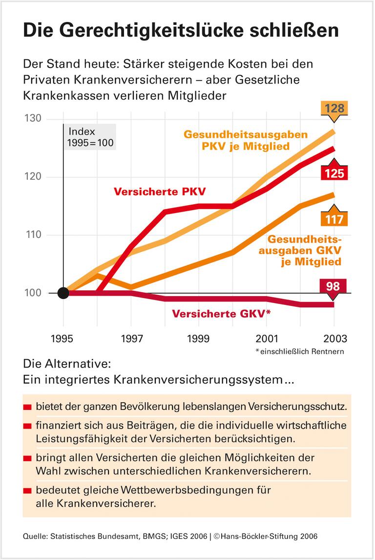 Bei der konkreten Ausgestaltung eines möglichen Gesundheitsfonds, wie ihn zuerst der Wissenschaftliche Beirat beim Bundesfinanzministerium vorgeschlagen hatte, sind noch viele Punkte offen. Zu früh also für eine abschließende Bewertung aller Risiken und Nebenwirkungen. Bei einem zentralen Defizit des deutschen Systems könnte die Inkassostelle aber eine Lösung erleichtern, schreiben die Gesundheitsfachleute Simone Leiber und Rudolf Zwiener aus WSI und IMK in einem Diskussionspapier: Der Fonds biete grundsätzlich einen "optimalen Anknüpfungspunkt", die PKV in das einkommensabhängige Beitrags- und Umverteilungssystem mit einzubeziehen.