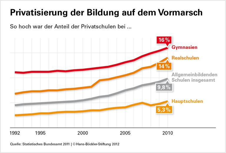 Die amtliche Statistik belegt, dass sich Privatschulen in Deutschland zunehmender Beliebtheit erfreuen. Ihr Anteil an allen Schulen ist seit 1950 kontinuierlich gestiegen. Besonders private Gymnasien sind gefragt: Rund elf Prozent aller Gymnasiasten, neun Prozent der Realschüler und drei Prozent der Hauptschüler waren 2008 Privatschüler.