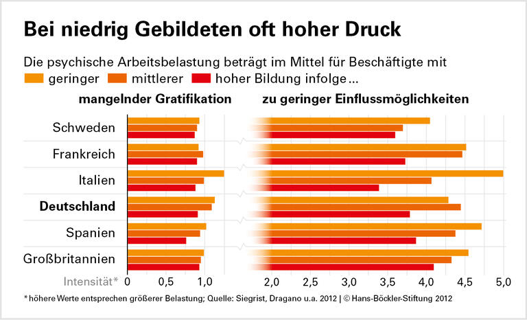 Arbeitsmarkt- und Sozialpolitik wirken sich aus. Jenseits des globalen Befundes, dass psychosoziale Belastungen im Job das Krankheitsrisiko erhöhen, beobachten die Wissenschaftler deutliche Unterschiede zwischen den untersuchten Staaten. Offenbar haben auch die Rahmenbedingungen auf dem Arbeitsmarkt und das soziale Sicherungssystem Einfluss darauf, wie verbreitet psychosoziale Belastungen sind – und in welchem Maße sie sich auf die Gesundheit auswirken.