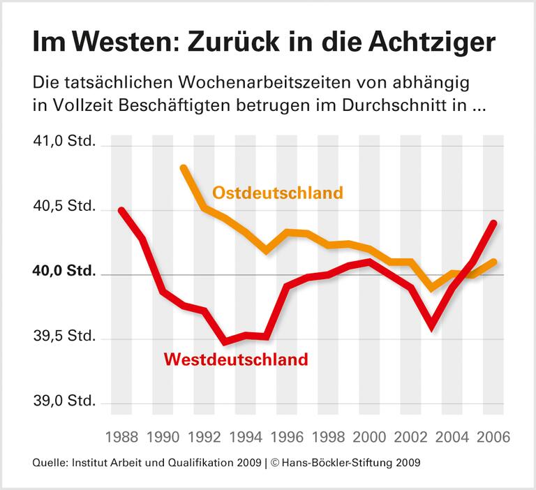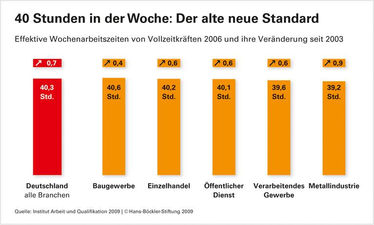 Nur wenige Europäer arbeiten länger. Die Arbeitszeit-Trends in Deutschland gehen vom Westen aus, so die Wissenschaftler. In Westdeutschland reagiere die Stundenzahl auf die Konjunktur, im Osten habe sich dagegen über die Branchen hinweg ein informeller 40-Stunden-Standard herausgebildet - in guten wie schlechten Zeiten. Mit den Arbeitszeiten ist die Bundesrepublik inzwischen in der Mitte der EU angelangt. Die gewöhnlichen Wochenarbeitszeiten entsprechen dem EU-27-Schnitt. Die Wissenschaftler des IAQ stellen klar: Die verbreitete Vorstellung, "Deutschland gehöre zu den Ländern mit den kürzesten Arbeitszeiten, muss gründlich revidiert werden." Länger als Vollzeitkräfte in der Bundesrepublik arbeiten in der alten EU nur jene in Großbritannien, Griechenland und Spanien.